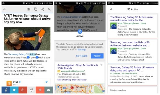 สมมุติว่า เราเปิดเบราว์เซอร์ Chrome อ่านบทความนึงเกี่ยวกับภาพยนตร์ที่น่าสนใจ อย่าง Captain America: Civil War เราแค่แตะคลุมข้อความไฮไลท์คำว่า America บนหน้าเว็บ chrome ก็จะหาข้อมูลตามที่เราไฮไลท์ทันที ซึ่งจะหาเป็น Captain America: Civil War พร้อมกับข้อมูลนักแสดง เนื้อหา ภาพประกอบ ข่าว และอื่นๆอีกมากมายมาแสดงบริเวณด้านล่างทันที